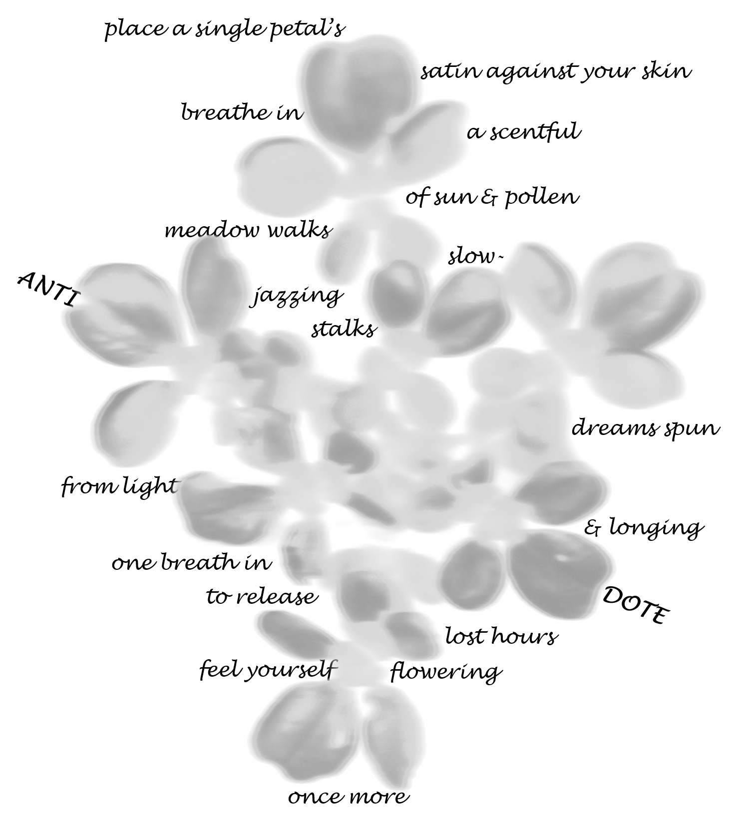 ANTI DOTE is an eco-photo-poem written specifically to be used with still or moving imagery. Line breaks and white (or petal) space are very different to how I initially jotted my draft text. The words always had to adapt themselves to the flower’s shape, but, in the animated form, I was able to match the poem’s shape with visual elements that give a sense of both the shifting seasons and environmental damage.